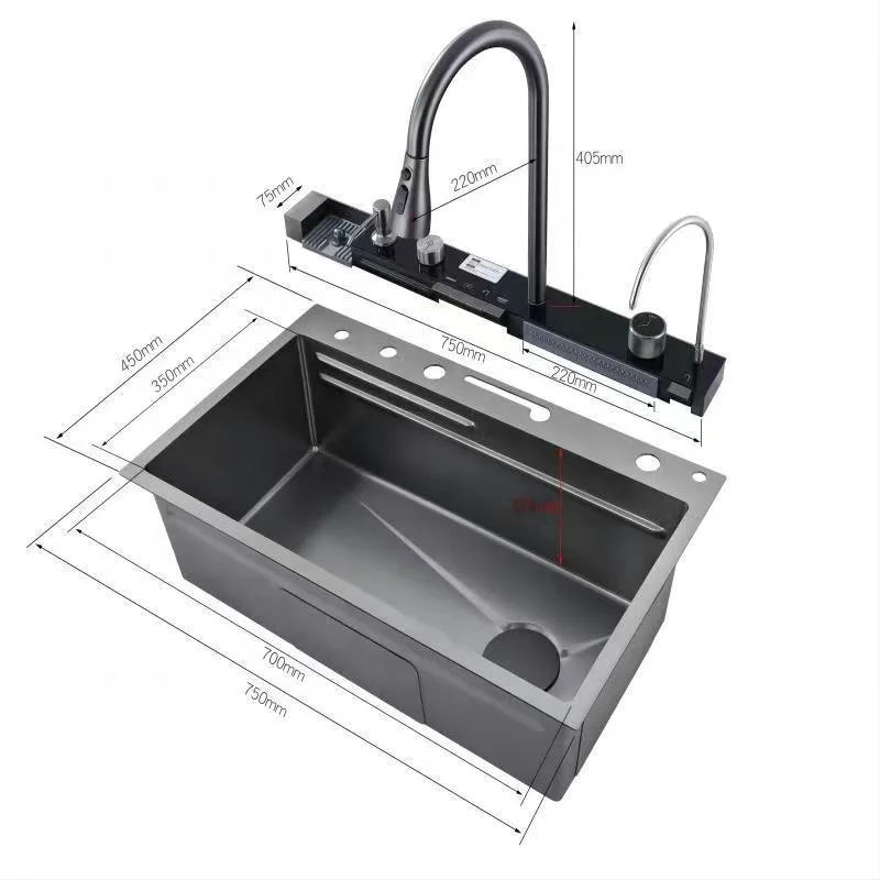Upgrade your kitchen with Nora, a masterpiece of innovation and elegance. Designed for the modern home, this Luxury Waterfall Nano Stainless Steel Kitchen Sink transforms your kitchen into a high-tech, stylish, and highly functional space.